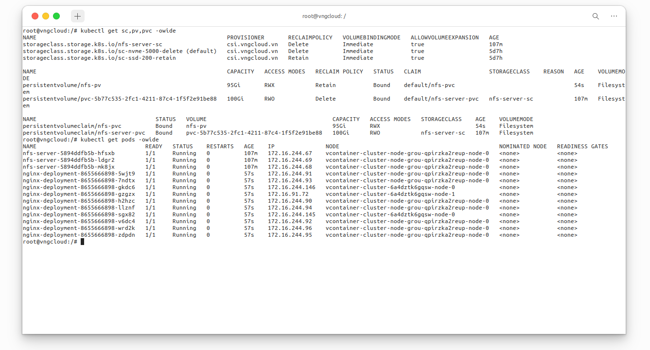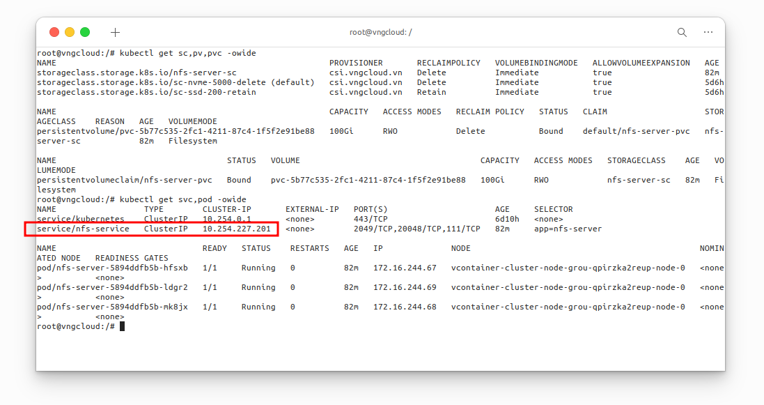 As previously discussed, the PersistentVolume created by the vContainer Storage Interface plugin will be utilized. Subsequently, this volume will be mounted to the NFS server deployment, followed by the creation of the NFS server service. This enables other services to access the NFS server deployment through the NFS server service. In my scenario, I selected node vcontainer-cluster-node-grou-qpirzka2reup-node-0 as the NFS server.