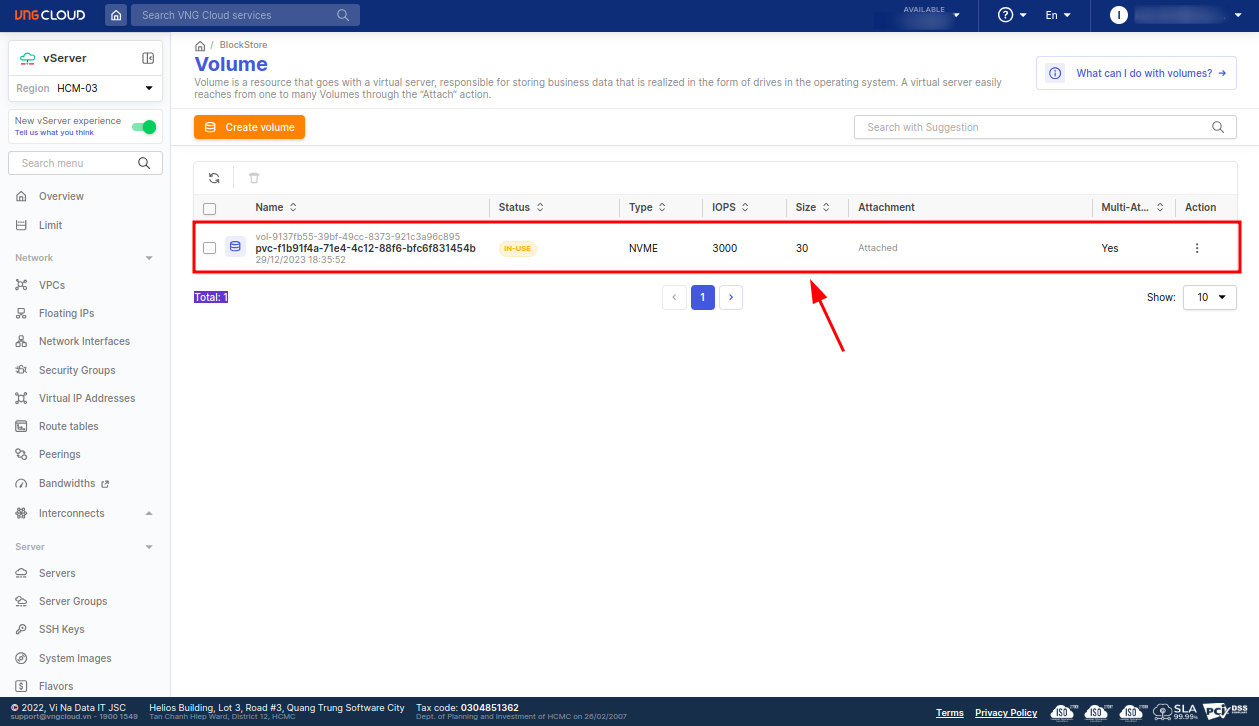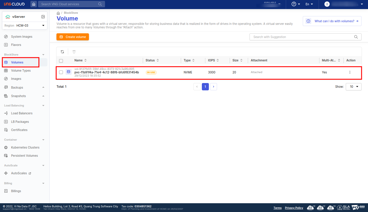 From the VNG CLOUD portal, users can verify the status of the PersistentVolumeClaim: