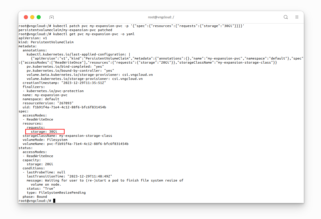 kubectl patch pvc my-expansion-pvc -p '{"spec":{"resources":{"requests":{"storage":"30Gi"}}}}'