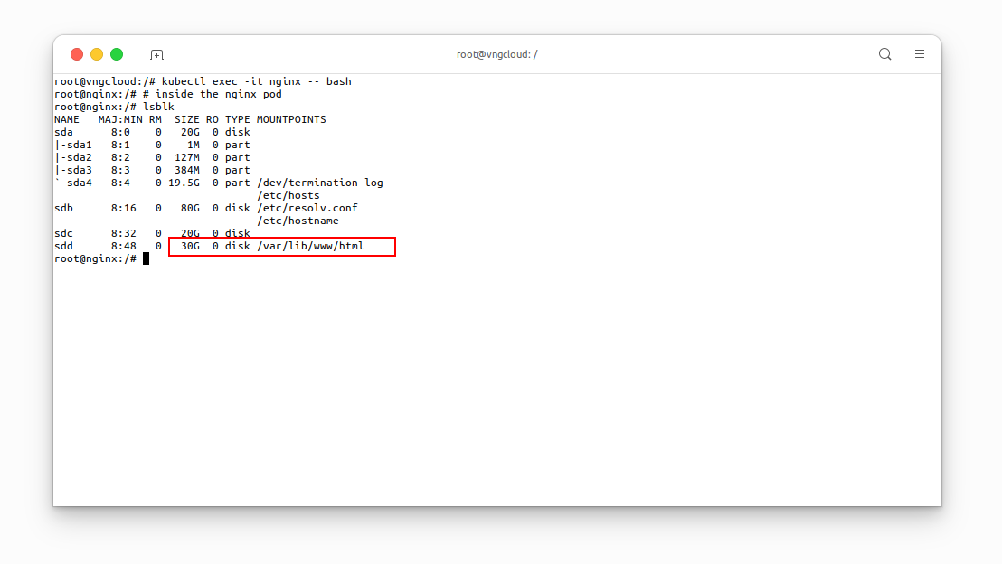 Let's exec into the nginx Pod and verify the new size of the volume: