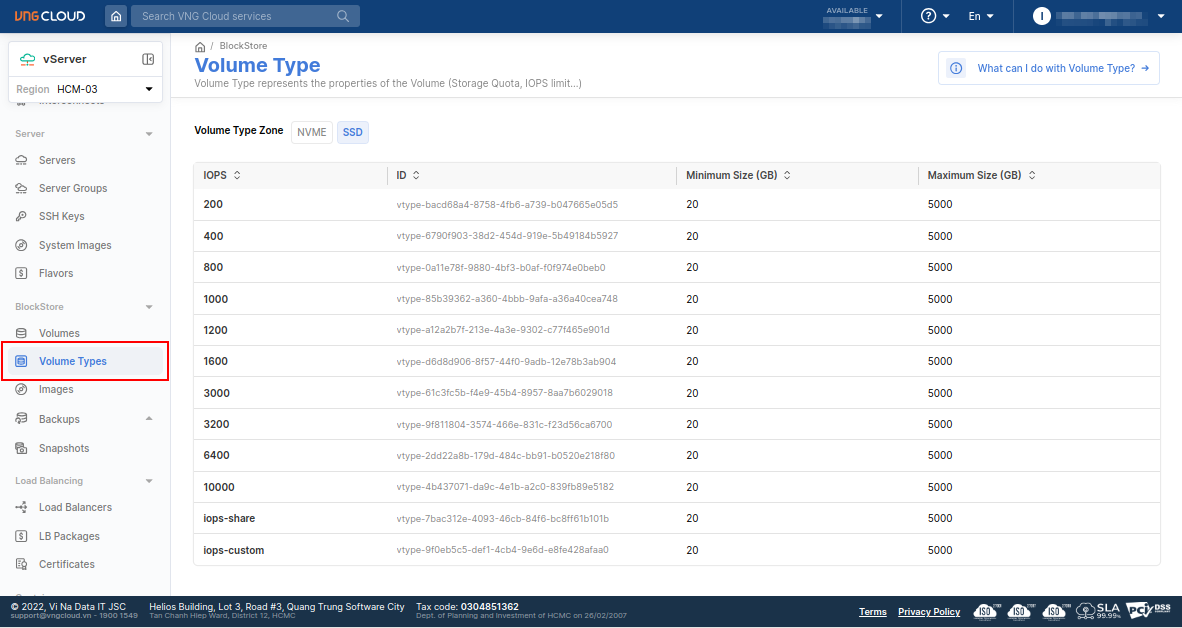 Users can explore the available options in the Volume Type section on the VNG CLOUD portal.